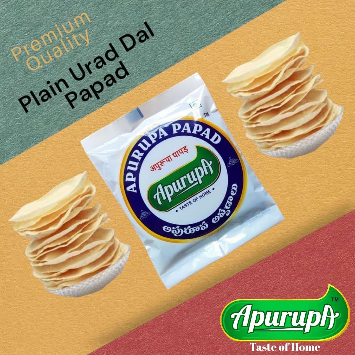 A promotional poster for Apurupa Papad, featuring a product packet surrounded by crisp papads on a rustic wooden table with spices. Product: Handcrafted Papads from Hyderabad. Tagline: "Experience the Authentic Taste of Tradition!" Vibe: Traditional, homemade, and crunchy