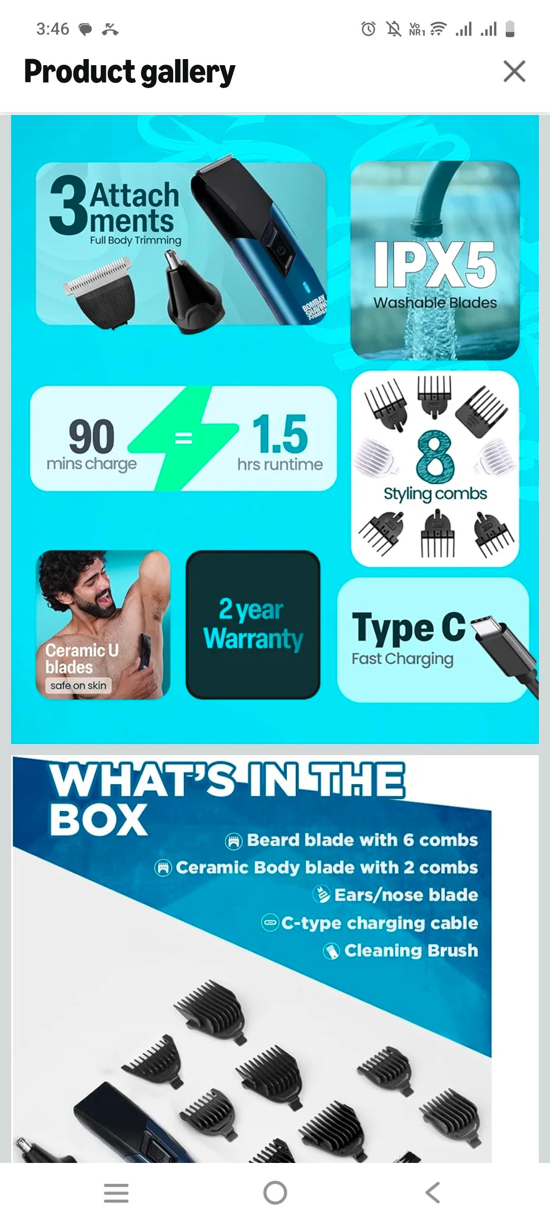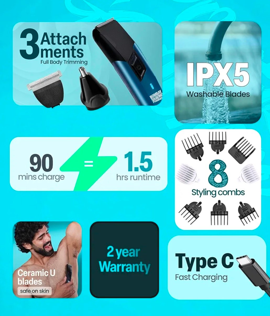 Bombay Shaving Company 11 In 1 Trimmer Men|All In One Full Body Trimmer|90 Min Charge Time|90 Mins Run Time|Hair, Ear, Beard, Body, Nose Trimme|Type C Charging|Power Groomer (New Model),Blue Recommended Uses For ProductBeard, Body, Face, Mustache, Nose ColourBlue Item Weight130 Grams BrandBombay Shaving Company Power SourceCorded Electric MaterialStainless Steel Comprehensive Trimming for the Whole Body: The Trimmer Men offers a versatile grooming solution designed to address all your trimming needs with precision and efficiency. This grooming tool is thoughtfully equipped with a set of 6 distinct styling combs tailored specifically for beard grooming, ensuring you can achieve any desired style with ease. Additionally, it includes 2 dedicated combs for body grooming, allowing you to maintain a neat and polished appearance across your entire body. For those tricky areas, like the nose and ears, a specialized attachment is included to ensure a tidy and well-groomed finish.