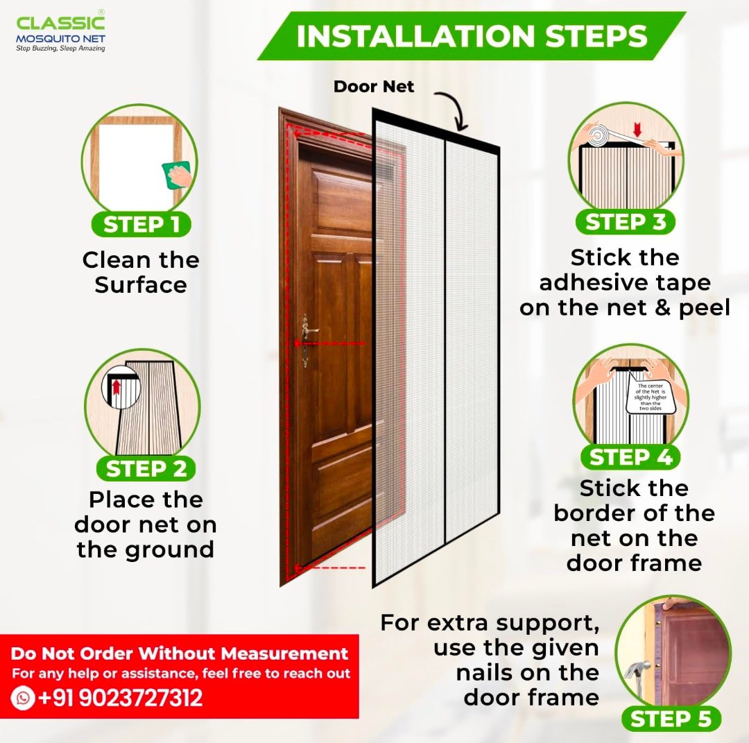 Classic Mosquito Net for Door Fiberglass Magnetic Curtain Auto Closing Insect Screen for All Door Types with Self Adhesive Hook Tape (200X100cms, Black) DISCLAIMER : Please take measurement before buying the product - https://youtu.be/xP0SXbt5wak Mosquito Protection: Walk through effortlessly! Classic magnetic mosquito net for door features a self-sealing closure for hands-free entry, perfect for kids and pets. Keep mosquitoes and bugs out and let fresh air in. Magnetic Closure: Classic door mosquito net with magnet ensures effortless opening and automatic seamless closing, providing excellent insect protection and easy access. Door Size Compatibility: Measure your door before purchasing to ensure a perfect fit for Classic magnetic door curtain. Where to use : Classic mosquito door net with magnet, you can use at main Door, Kitchen Door, Bedroom Door, Balcony Doors, Garage Doors.