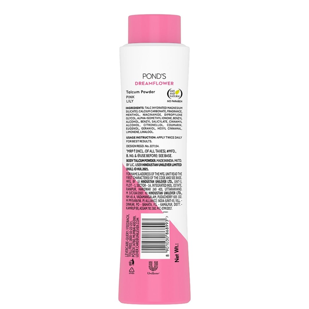 Overview New and improved Pond's Dreamflower Talc is infused with a fragrance like 1000 Lilies to give you an instant burst of freshness. The formula enriched with vitamin B3 helps give you a glowing skin look. Soft and smooth micro talc that helps absorb sweat while giving you a perfume-like fragrance throughout the day. Talc, the main ingredient, is one of the softest minerals, with a fine texture - found in nature, and helps to absorb sweat. Pond’s Dreamflower talcum powder has the power of lilies that keeps you rejuvenated and fresh for 8 long hours and gives you soft and smooth skin. Perfect for summers and suitable for both men and women, its fresh floral formula fights body odour and bacteria. It helps absorb sweat making your skin feel soft & smooth so that you can look like your beautiful self. Pond’s Dreamflower talc comes in a vibrant pack with a twist-lock button (cap) for quick and easy dispensing. Use a generous amount on your body and face right after the shower in the morning and before going to bed at night for that soothing freshness. Get the confidence of a fragrant glow that stays with you through the day with Pond's Dreamflower Fragrant Talc! Features & Benefits - New and Improved formula. - Infused with the fragrance like 1000 Lilies. - Formula with vitamin B3, for glowing Skin. - Its soft and smooth micro talc helps absorb sweat & prevents body odour. - Makes your face look brighter instantly. - The confidence of a fragrant fresh glow through the day. Usage - Gently dab the powder over the face and neck area and spread evenly. Safety Warnings For external use Ingredients Talc, Fragrance, Menthol