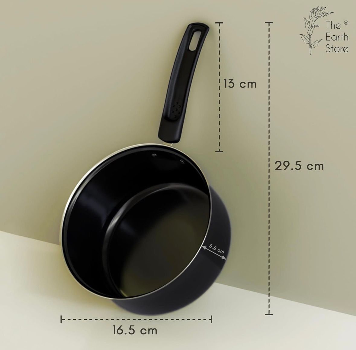 The Earth Store EcoLuxe Small Saucepan for Tea Milk and Chai Pan Induction Base and Gas Stove T Pan (patila)|Tea/Milk Boiling Pot Vessel | mini Sospan with Bakelite Handle 950 ML Capacity 16cm, Black Material: Enamel-Ceramic Coated Iron Finish Type: Enamel Brand: The Earth Store Colour: Black Capacity: 950 Milliliters Product Dimensions30D x 16W x 5.5H Centimeters Versatile and Eco-Friendly: The Earth Store EcoLuxe Small Saucepan is designed for multi-purpose use, making it perfect for boiling tea, milk, and chai. Crafted with an eco-conscious mindset, this saucepan is an ideal choice for eco-friendly consumers. Dual Compatibility: This saucepan features an induction base, ensuring compatibility with induction stovetops, and is equally adept on gas stoves. Enjoy the flexibility to use it on your preferred cooking surface without compromising on performance. Tough and Stylish Construction: The T Pan (patila) boasts a sleek design with a durable 2-Way Ceramic Coating black finish, adding a touch of sophistication to your kitchen. Its robust construction ensures longevity, making it a reliable addition to your cookware collection. Compact Size, Maximum Convenience: With a 950ml capacity and a 16cm size, this mini saucepan is perfect for small to medium-sized tasks. Whether you're preparing a cozy tea for one or a quick milk boil, its compact design makes it a go-to choice for everyday cooking. Comfortable Handling: The saucepan is equipped with a Bakelite handle, providing a comfortable and heat-resistant grip. This feature ensures safe and easy handling, adding an extra layer of convenience to your cooking experience.