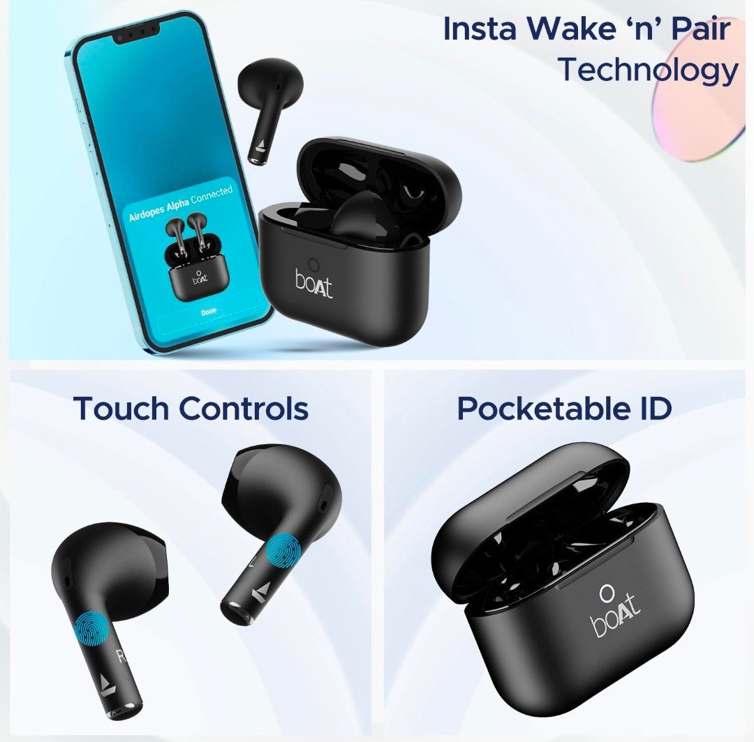 Product details Top highlights BrandboAt ColourJet Black Ear PlacementIn Ear Form FactorIn Ear Impedance100 Ohms Noise ControlActive Noise Cancellation Low Latency BEAST Mode: Experience lag-free high-quality gaming with low latency of up to 50 ms. Visuals align with impactful audio for realistic action. Extensive Playtime: Up to 35 hours of performance gives you plenty of time to listen to your preferred tunes. As for OTT, you can tick off your watchlist with Airdopes Alpha as your audio companion. boAt Signature Sound: Powered by dual 13 mm drivers, these earbuds deliver matchless boAt Signature sound with superior bass. ENx Tech with Dual Mics: To offer unparalleled sound clarity, the dual mics of these earbuds are enhanced with ENxTM tech that wards off background noise. Engage in online discussions easily regardless of your location as your voice is heard without distortion. ASAP Charging: 10 minutes of charging yields about 120 minutes of seamless performance. Revel in music to your heart’s content in no time at all!